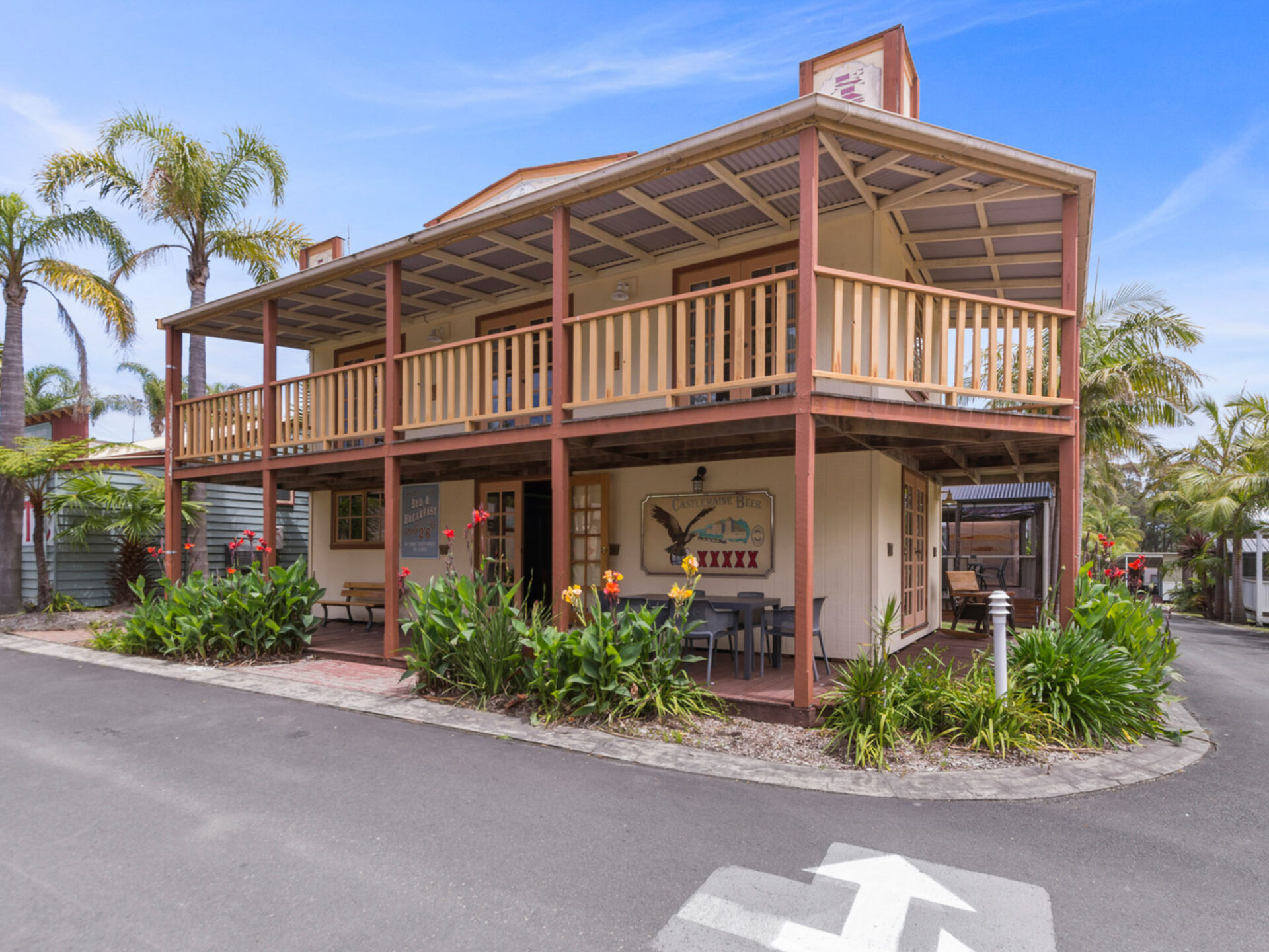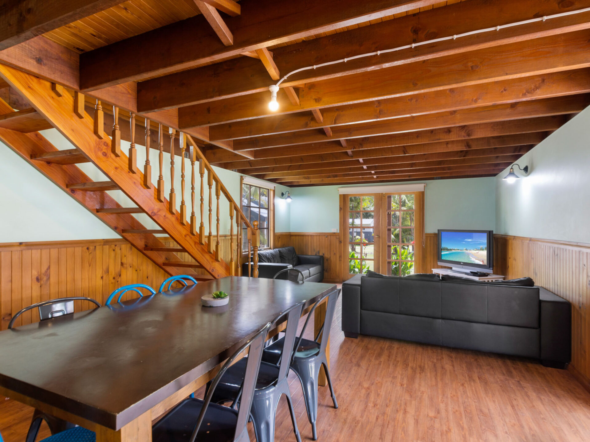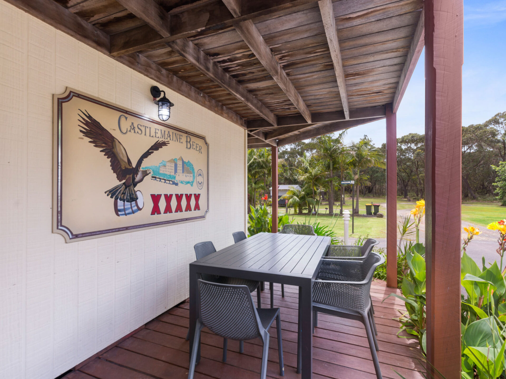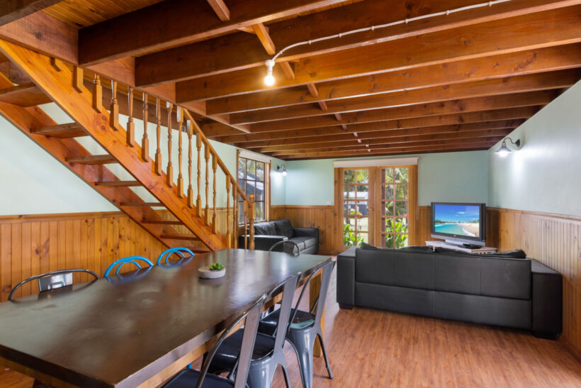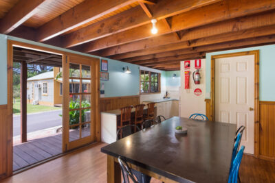 Escape to a one-of-a-kind stay in the Olde Town Pub—an original Wairo Beach icon reimagined for modern comfort. This spacious cabin sleeps up to eight guests across three bedrooms with two queen beds and two bunk beds. Cook up family favorites in the full kitchen, then unwind on the private deck. Air conditioning ensures year-round comfort, all just a short stroll from the beach.