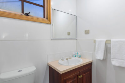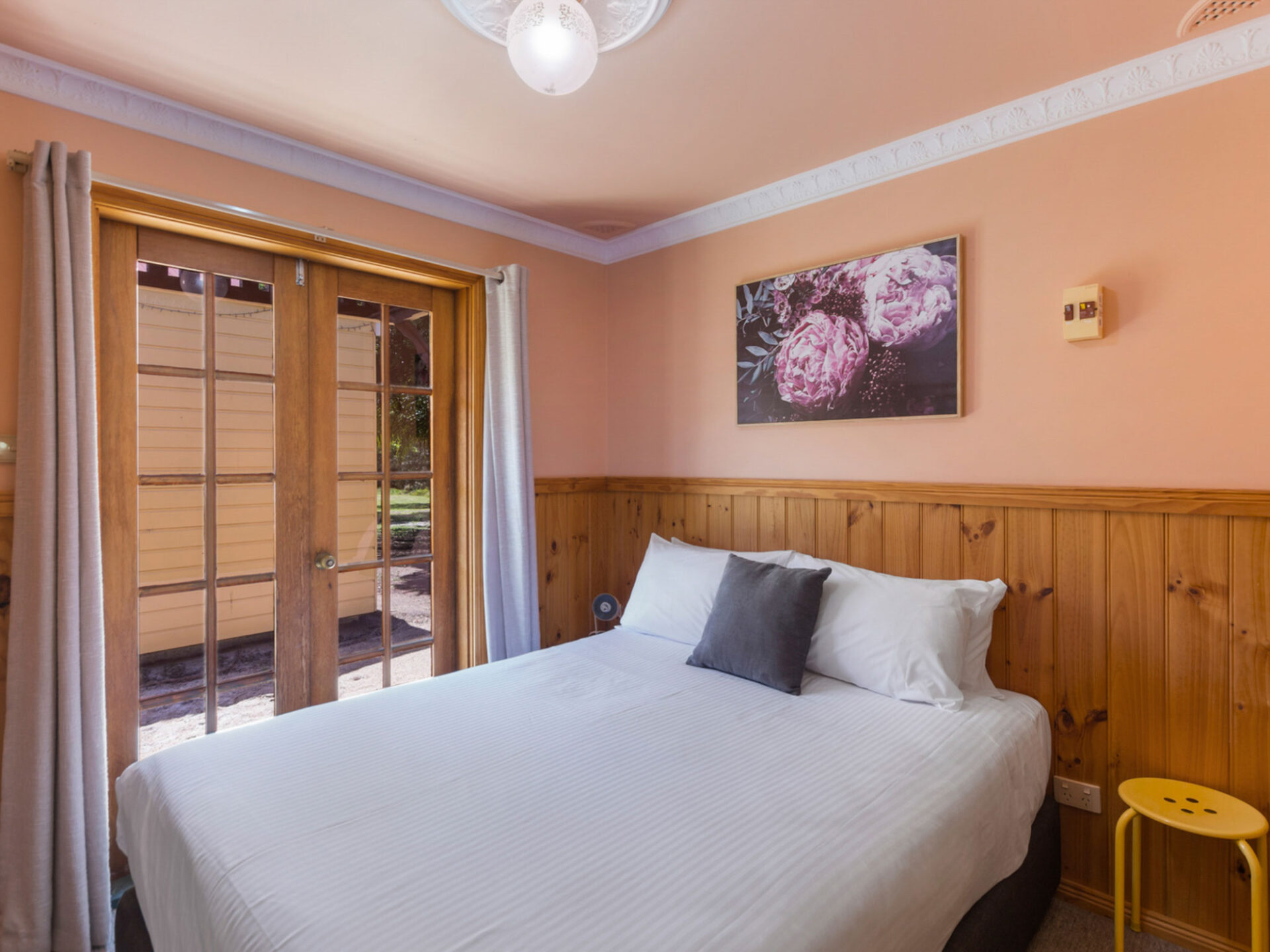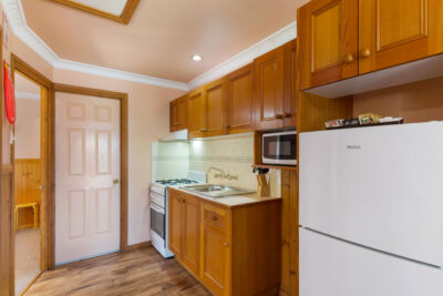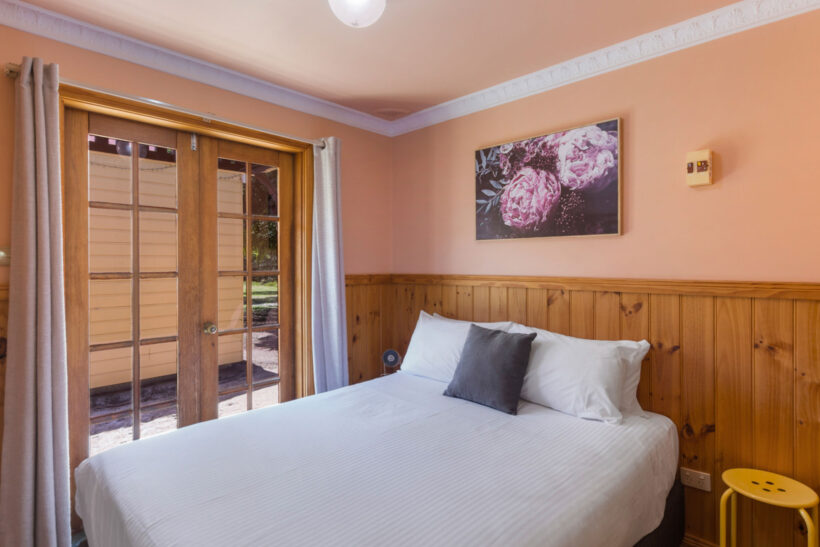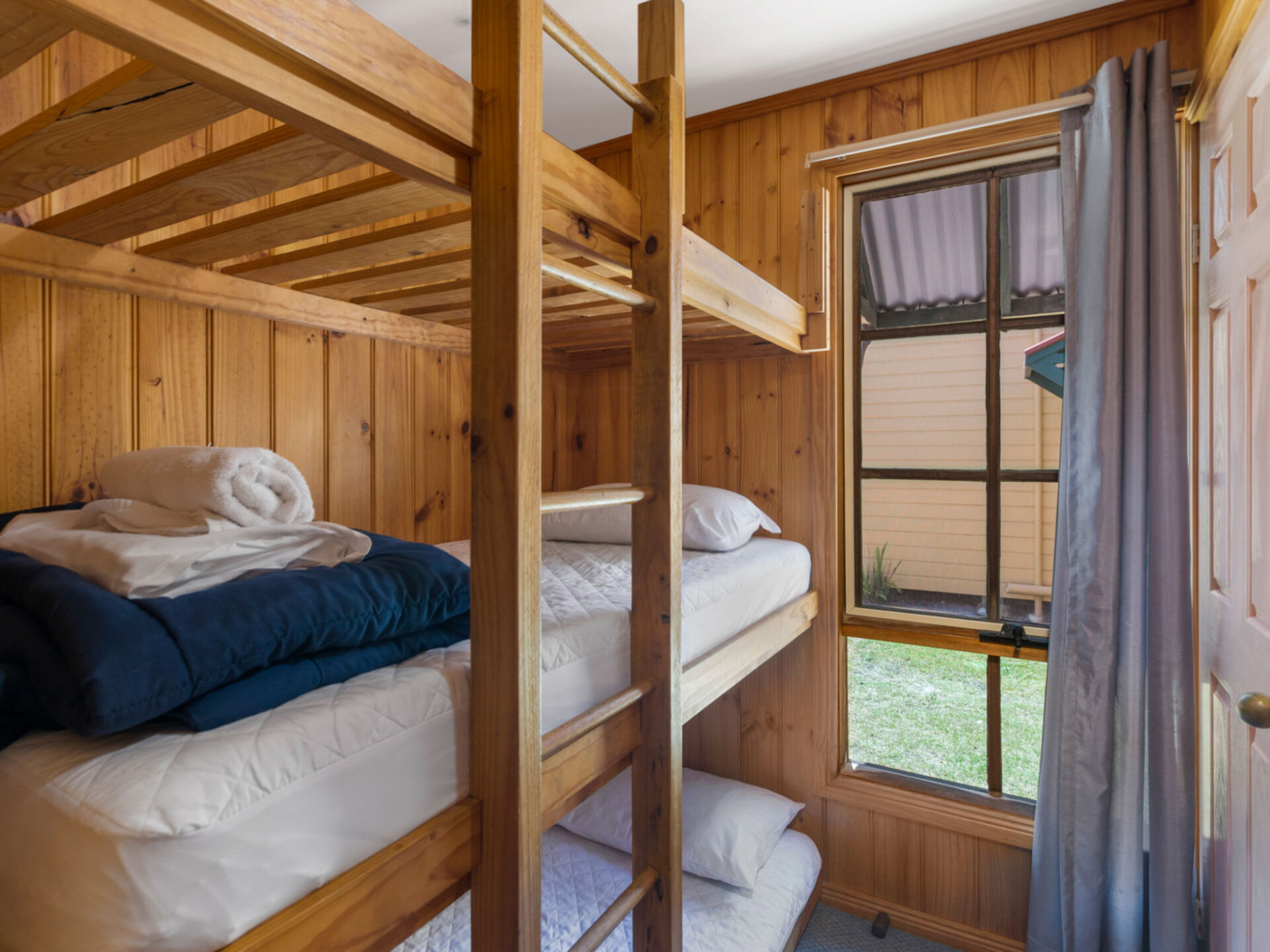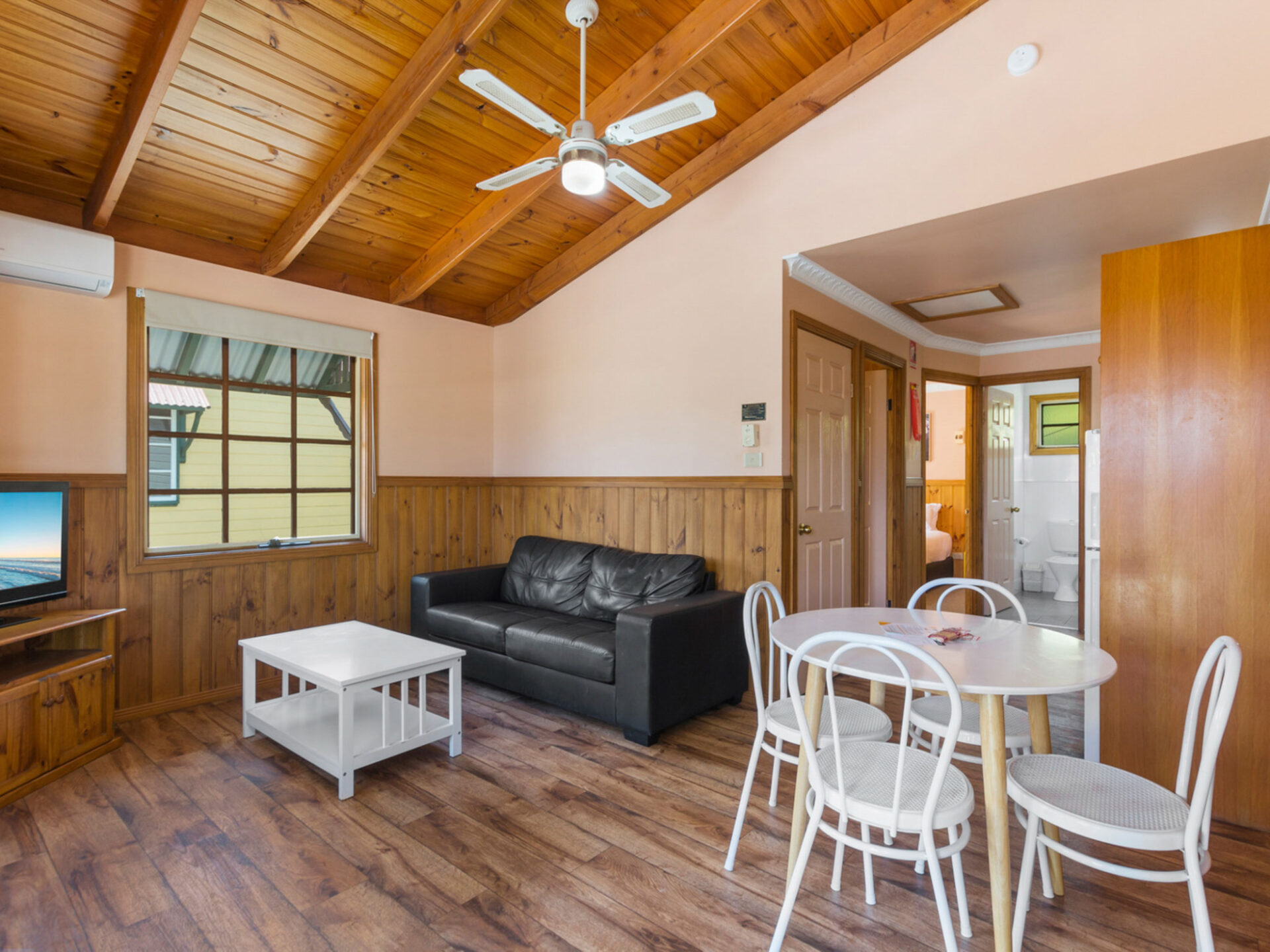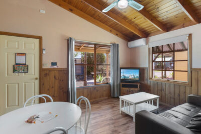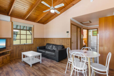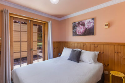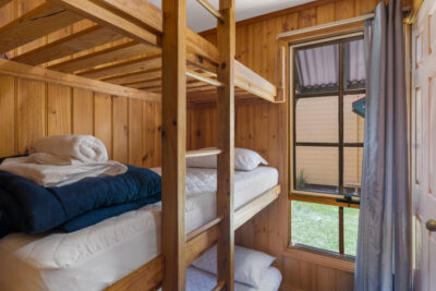Step into the Olde Town Bakery—once a bustling storefront, now a cosy retreat full of vintage flair. Ideal for small families, this two-bedroom cabin sleeps up to four with one queen bed and one bunk bed. A full kitchen, air conditioning, and a private deck offer comfort and convenience. Tucked in a peaceful garden setting, it’s perfect for a quiet escape near the beach.